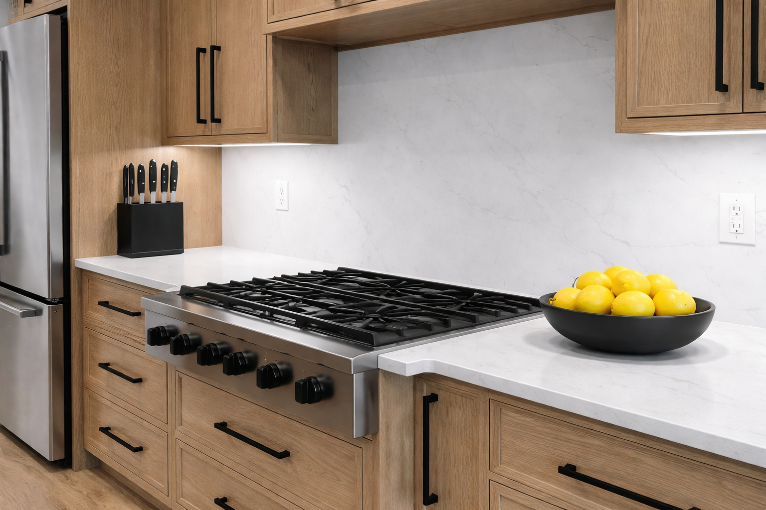 Material continuity was key—carrying the quartz from countertop to backsplash creates a clean, uninterrupted foundation for the space.
